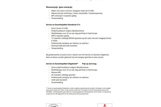 ** Service en garantiepakket Uitgebreid is enkel mogelijk op Hyundai en Mitsubishi modellen. Dit pakket is niet mogelijk bij occasions onder de € 4.500,- en bij occasions ouder dan 72 maanden en/of een kilometerstand boven de 100.000km. Fabrieksgarantie gaat altijd voor de Bovag garantie. Fabrieksgarantie wordt (indien van toepassing) aangevuld door Bovag garantie tot de totaal genoemde garantieperiode.