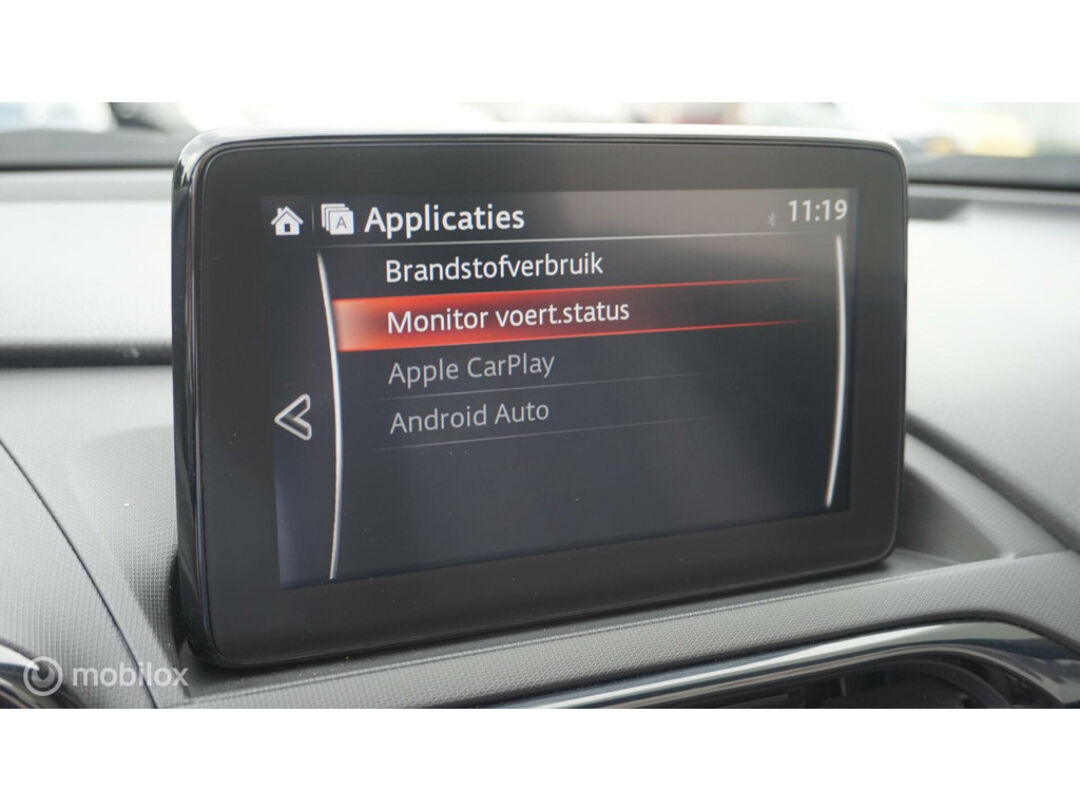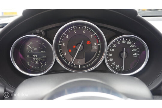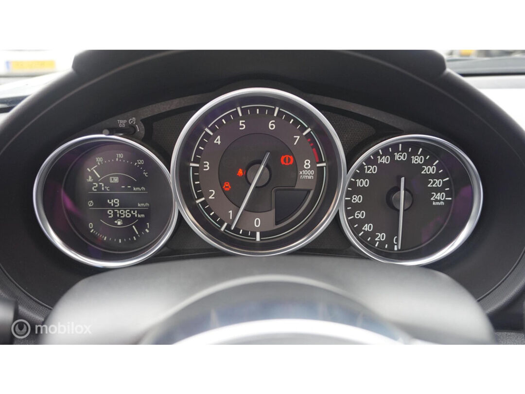 Het full map navigatiesysteem en het audiosysteem (met DAB-ontvangst!) bedient u met knoppen op het stuur of met gesproken commando's. Dankzij automatische airconditioning is het interieur behaaglijk warm of verfrissend koel. De elektronische systemen in deze Mazda helpen u actief om comfortabeler te rijden. Een automatisch inschakelbare verlichting en een regensensor houden de omstandigheden onderweg in de gaten. Nooit meer last van een slapende rechtervoet dankzij de uitgekiende cruise control! Makkelijk en veilig is de keyless start. Met de elektronische sleutel op zak start u de auto met enkel een druk op de knop. Wat u ook in deze auto kunt vinden zijn automatisch dimmende binnenspiegel, lederen stuur, centrale deurvergrendeling met afstandsbediening, boordcomputer en lederen versnellingspook.