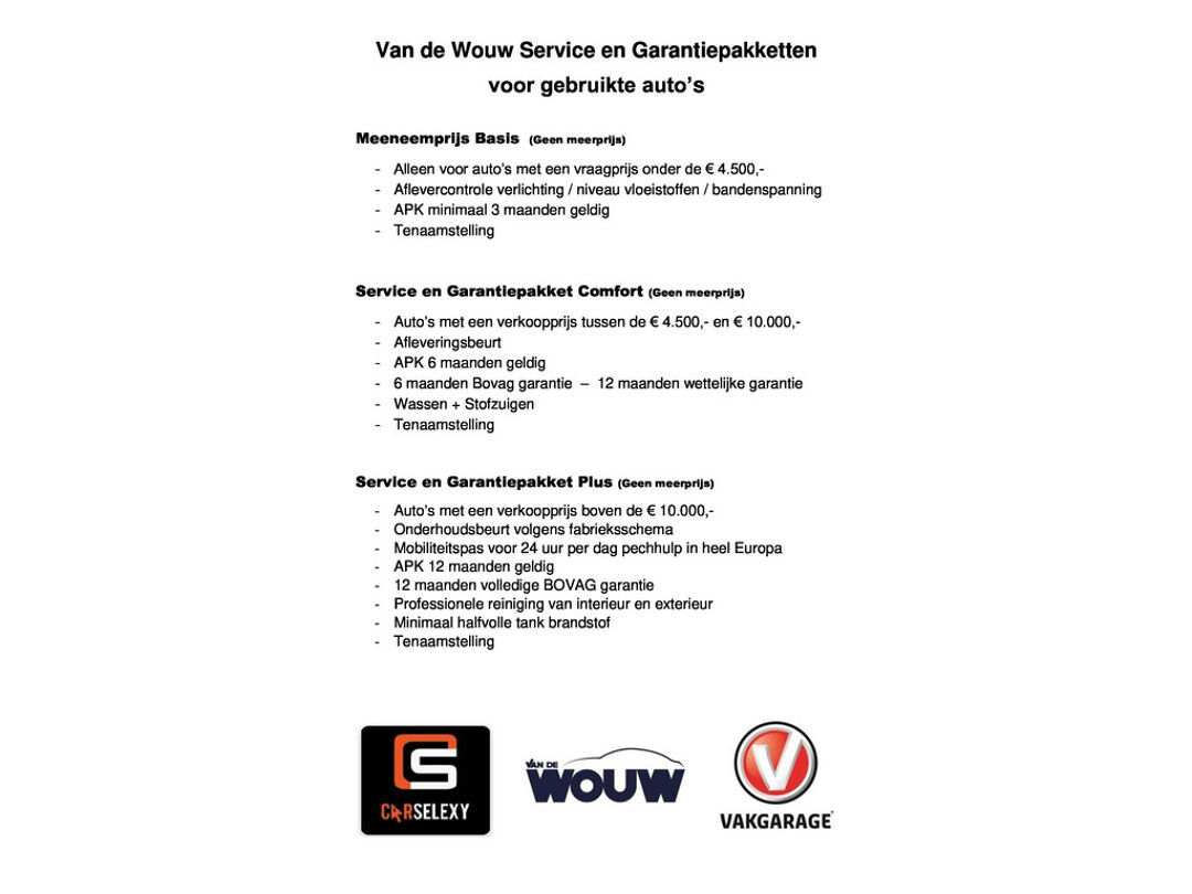 Onze auto's worden voor een rijklaarprijs aangeboden, dus zonder extra bijkomende kosten. Afhankelijk van de vraagprijs worden de auto's klaargemaakt volgens onderstaande service- en garantie pakketen: